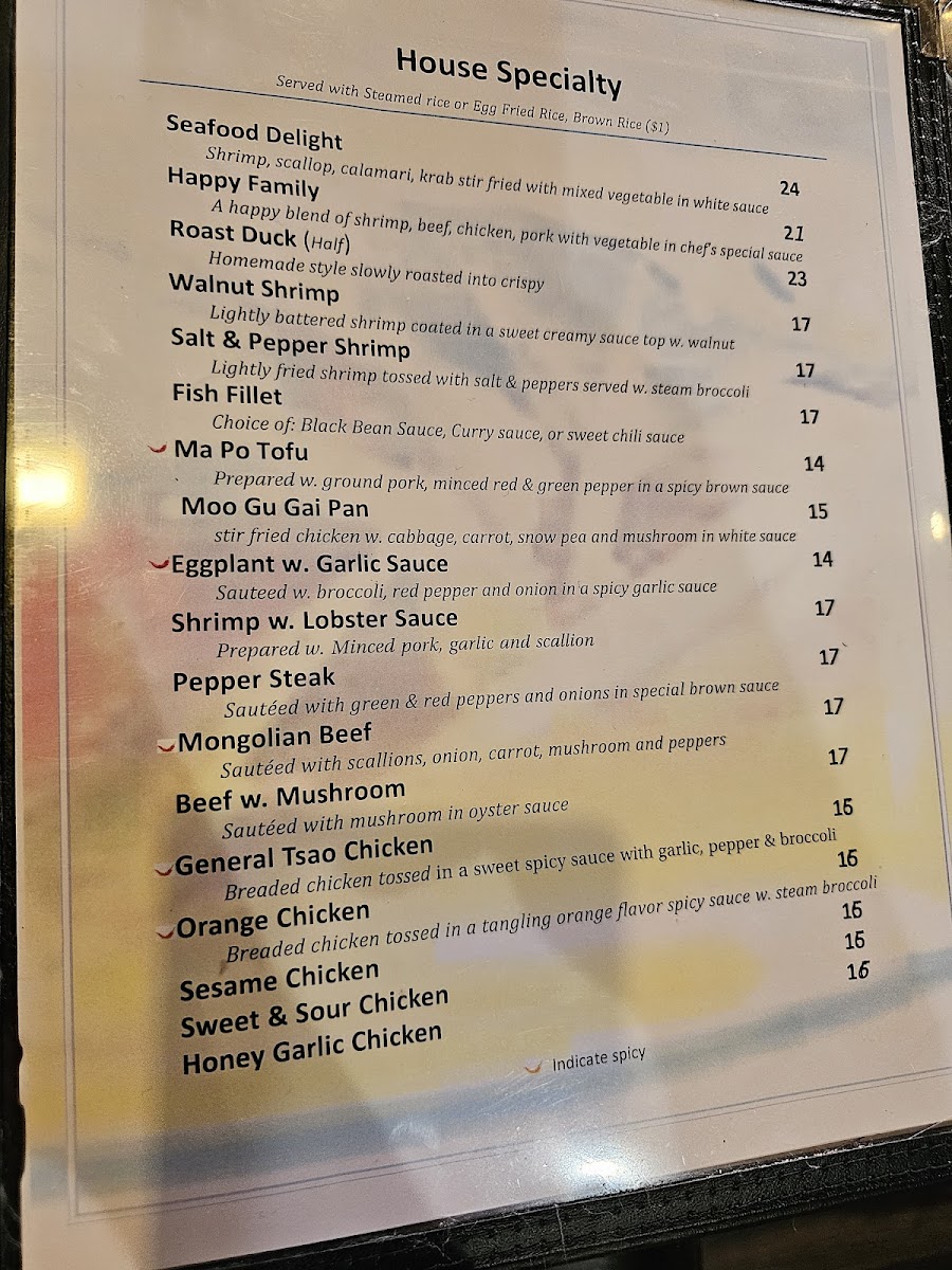 A happy blend of beef, chicken, pork, and shrimp with vegetables in chef's brown garlic sauce.