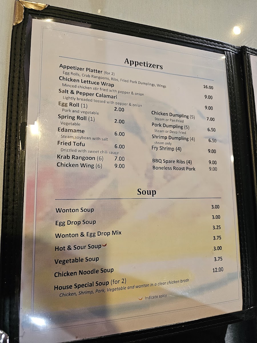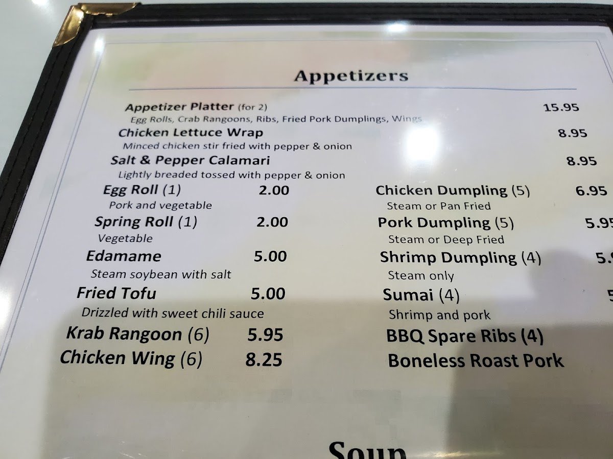 2 pieces egg rolls,2 wings, 2 pieces ribs, 2 pieces crab Rangoon, 2 pieces pork dumplings.